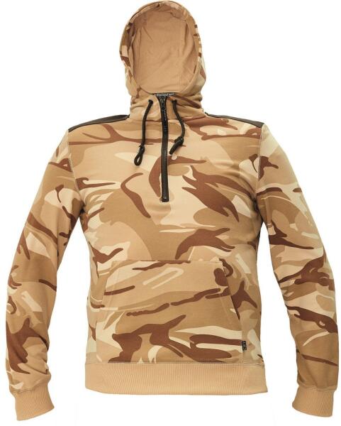 Kényelmes férfi terepmintás pulóver kapucnival, kenguru zsebbel és félcipzárral. A pulóver alsó széle és az ujjak elasztikus mandzsetával vannak ellátva. Megerősített rész a váll területén. Poliészter és pamut kombinációjából, szőtt kötött anyagból készül. A népszerű terepmintás ruházat remek választás erdei sétákhoz, horgászáshoz, vagy hétköznapi viseletre.