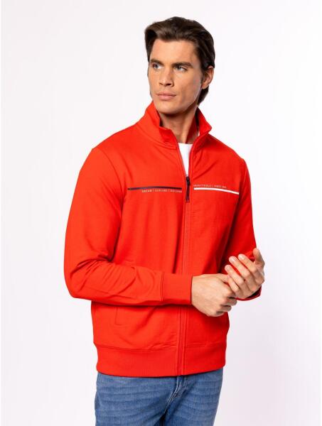 Férfi cipzáros, állógalléros pulóver, klasszikus szabással, bordás passzés kézelővel és aljjal, egyenes zsebekkel, mellkasán és hátán márkajelzéssel, alja passzén dekor szalaggal