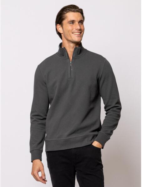Férfi bebújós, cipzáros, állógalléros pulóver, klasszikus szabással, bordás passzés kézelővel és aljjal, két féle anyagból, gallér cipzárján 3D márkajelzéssel