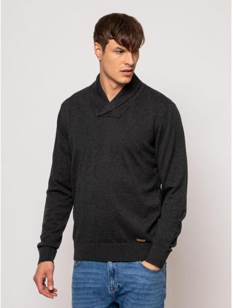 Férfi finom kötött pulóver, trendi színekben, klasszikus szabással, ízléses sálgallérral, tiszta pamut anyagból, bordázott kötésű kézelővel és aljjal, kis bőr márkajelzéssel az eleje alján