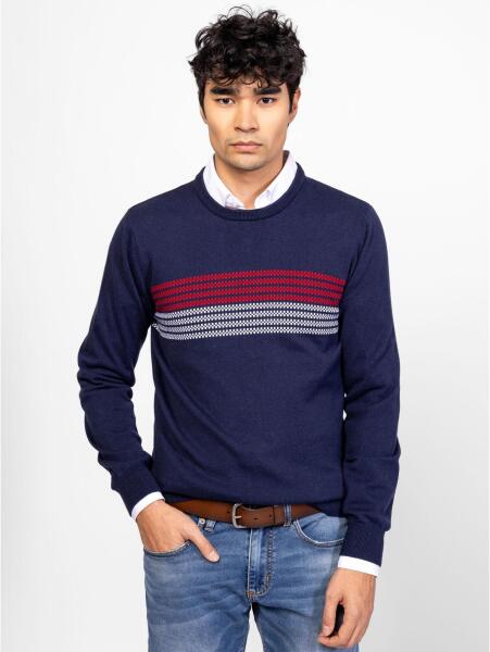 Férfi finom kötött pulóver, klasszikus szabással, mellén csíkozással, kerek nyakkal, bordás kötött kézelővel, nyakkal és aljjal, kis szövött márkajelzéssel az eleje alján