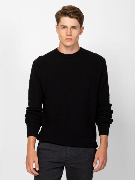 Férfi finom kötött pulóver klasszikus szabással, kerek nyakkal, kis szövött márkajelzéssel az oldalában, bordás kötött nyakkal, kézelővel és aljjal